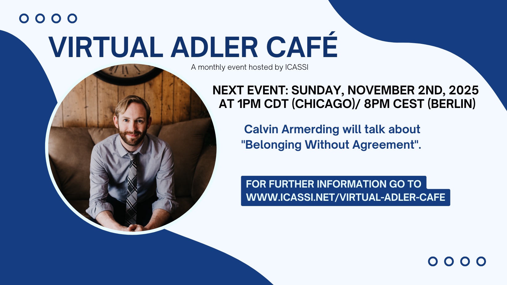 The next Virtual Adler Café will be held on Sunday, November 2nd, 2025, at 1pm Chicago, 2 pm New York, 7 pm UK, 8 pm Germany, 9pm Israel, depending on your time zone. Calvin Armerding will talk about: “Belonging Without Agreement”. Together we will explore how we can stay connected to others even when our beliefs, values, or choices diverge. Drawing from Adlerian ideas of social interest and mutual respect, this talk invites reflection on how genuine belonging depends not on sameness, but on courage, empathy, and cooperation.