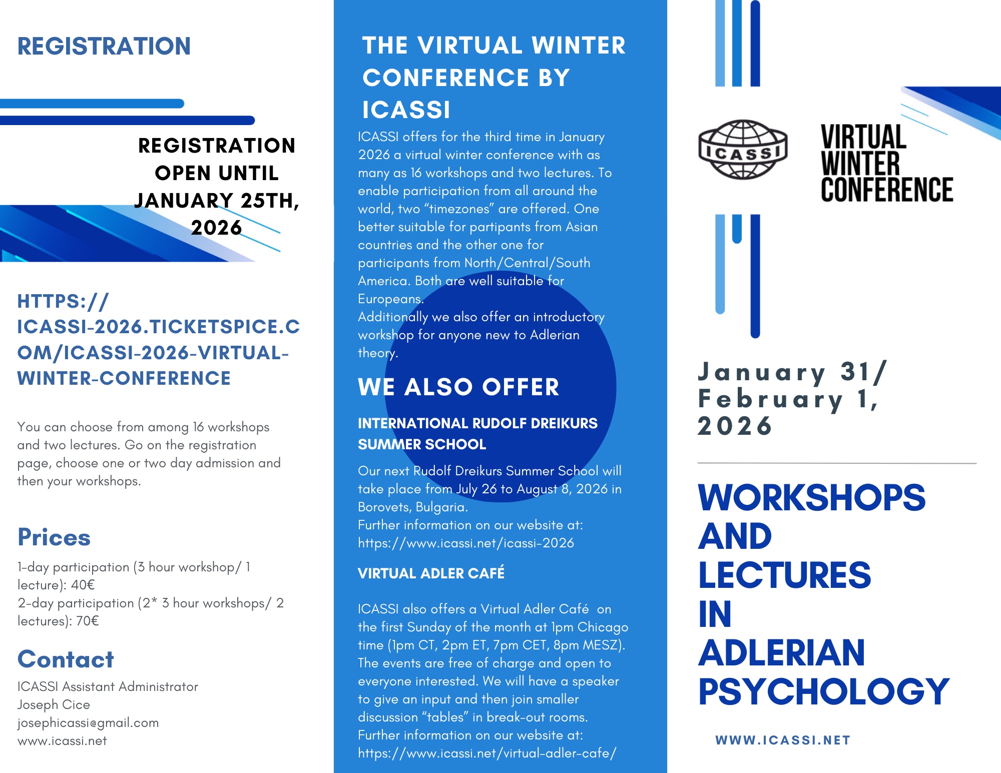 A set of by-laws and a description of organizational characteristics were developed. Since the inception of the summer school (1962), these documents became a framework ensuring the survival of the organization. Currently, ICASSI has three co-chairpersons, seven board members, and administrative staff with responsibility for organizing the annual ICASSI summer school (each year in a different country, sometimes in a virtual format). Recently, a virtual Adler Café, the Virtual Winter Conference, and mini ICASSI meetings were added to ICASSI activities.