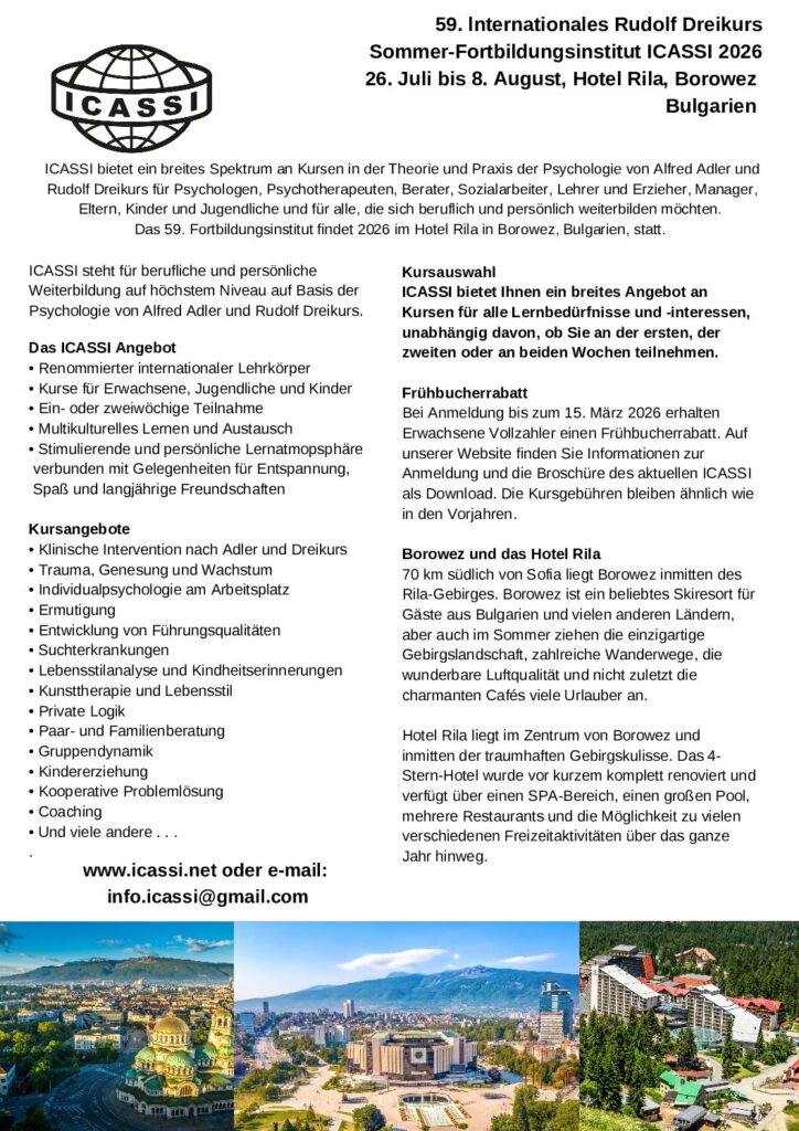 Die 59. internationale Rudolf Dreikurs Sommerschule von ICASSI wird in Borovets in Bulgarien vom 26. Juli bis 8. August 2026 stattfinden. Die Sommerschule bietet Kurse in Adler/Dreikurs Theorie und Praxis für Psychologen, Therapeuten, Berater, Sozialarbeiter, Lehrer, Erzieher, Manager, Eltern, Kinder und Jugendliche und Personen, die berufliche Weiterbildung suchen.